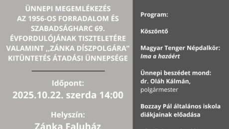 Zánka Község Önkormányzata szeretettel meghívja a település lakóit és minden érdeklődőt az 1956-os forradalom és szabadságharc 69. évfordulója alkalmából tartandó ünnepi megemlékezésre. Együtt tisztelgünk az 1956-os hősök előtt, és köszöntjük közösségünk kiemelkedő személyiségét, akit „Zánka Díszpolgára” címmel tüntetünk ki. Időpont: 2025. október 22., szerda, 14:00 Helyszín: Zánka Faluház (8251 Zánka, Rákóczi út 32.) Kérjük, érkezzenek…
